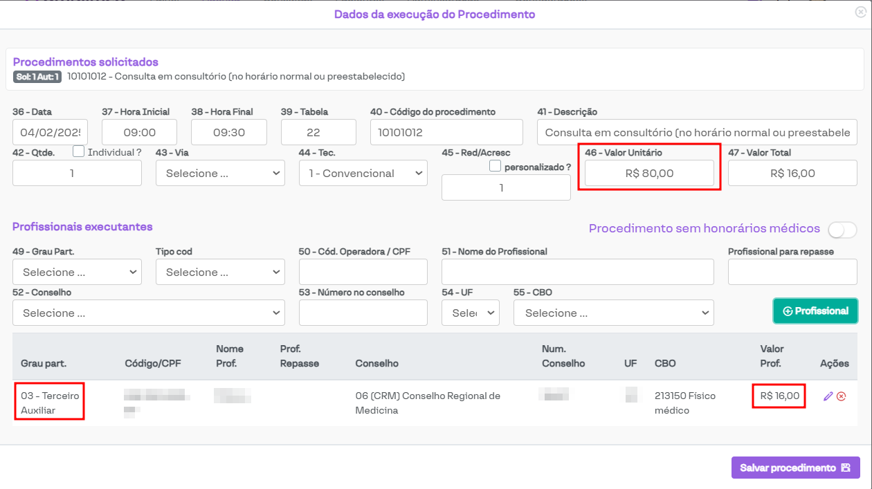 No exemplo da imagem acima, se um procedimento tem o valor de 80 reais e o campo 49 - Grau Part. na seção de execução do procedimento estiver selecionado como 03 - Terceiro Auxiliar, o valor que o profissional receberá será 20% do valor total.