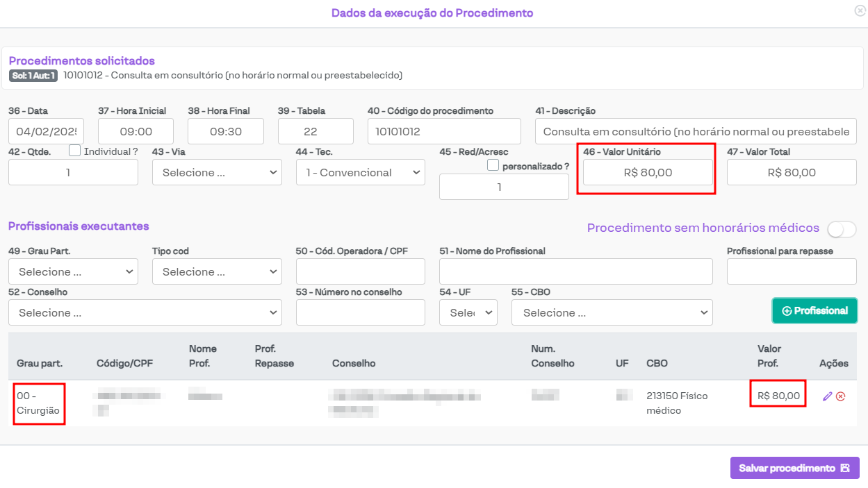 No entanto, se o campo for alterado para 00 - Cirurgião, o qual recebe 100% do valor, o valor será alterado para 80 reais, conforme imagem a seguir.