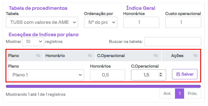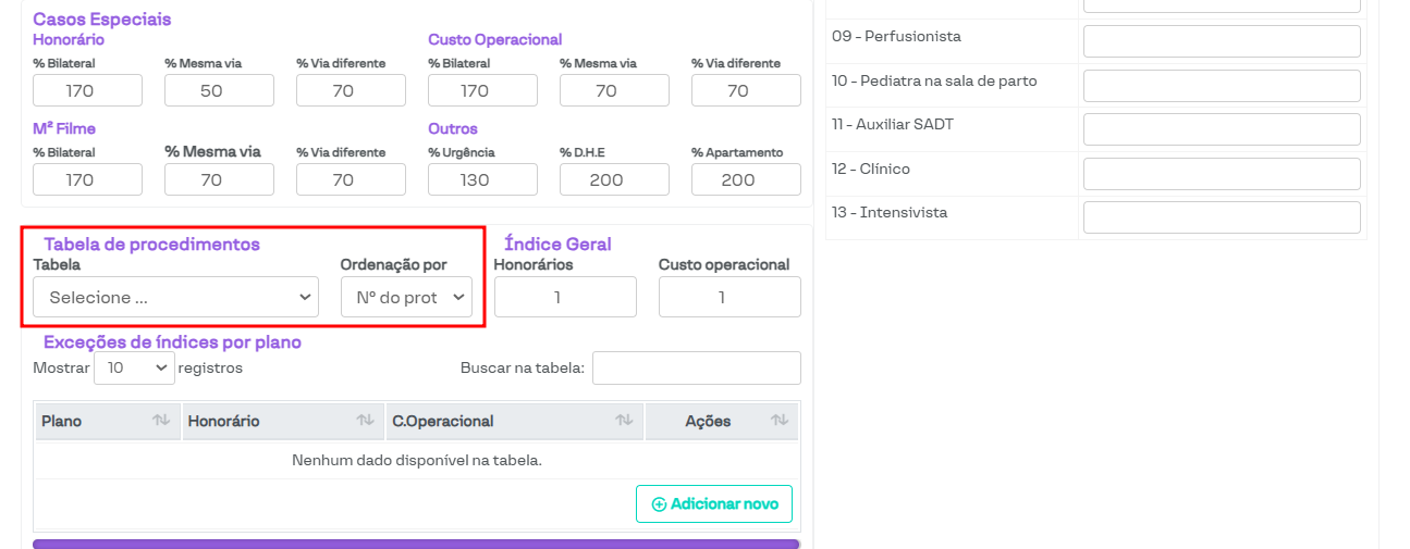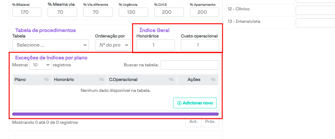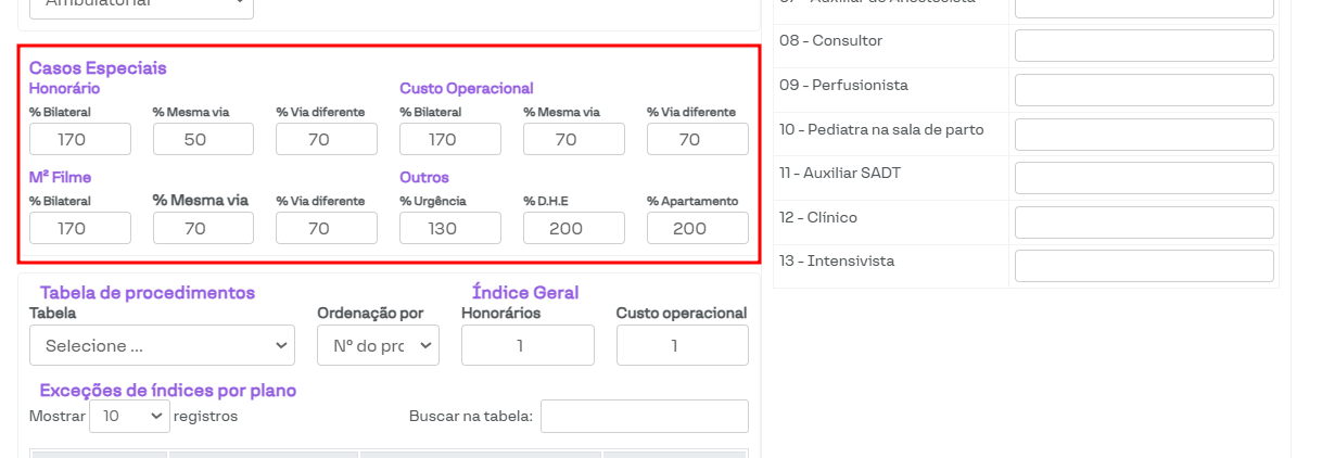 Nesta seção, é possível configurar valores ou custos que não se enquadram nos procedimentos padrão. Consulte a operadora do respectivo convênio para verificar se os valores estão conforme o esperado.