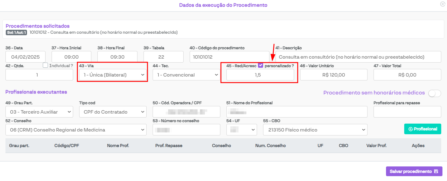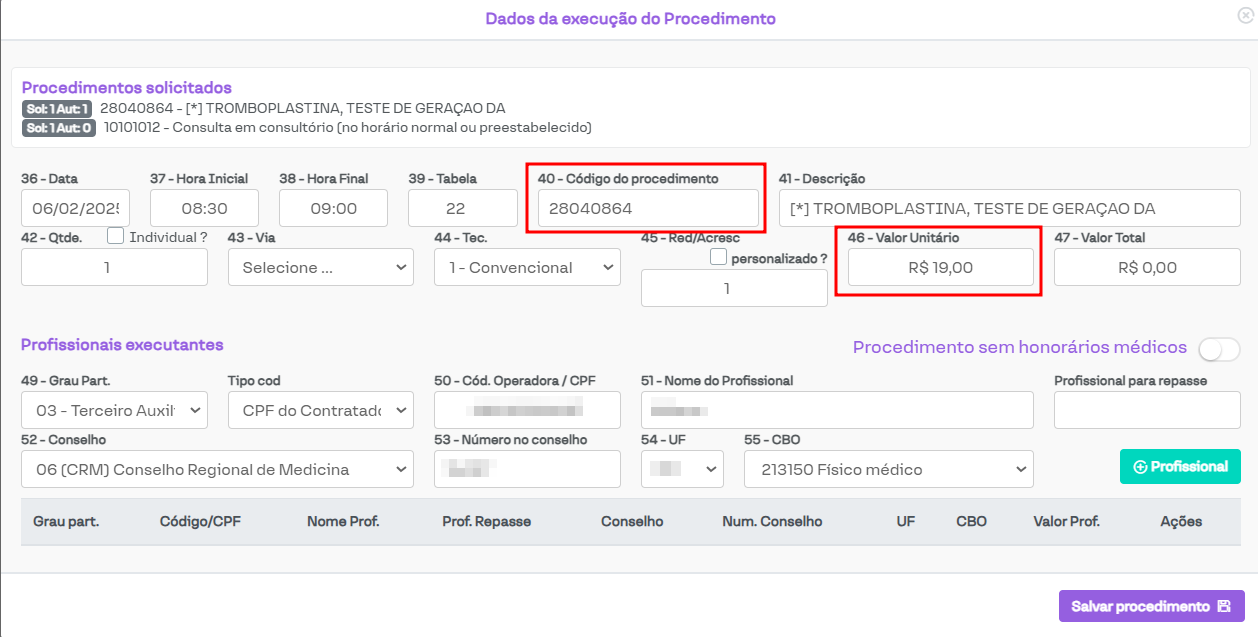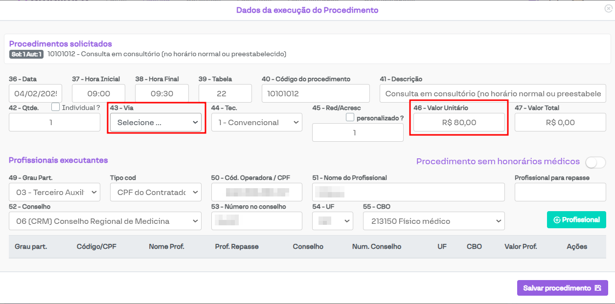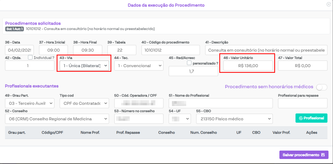 Os valores serão alterados ao selecionar a via na parte de Procedimentos Executados, conforme a imagem a seguir.