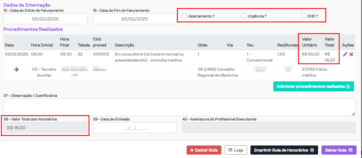 Além disso, para guias de honorários, dependendo das opções selecionadas, o valor final da guia irá variar, conforme ilustrado nas imagens a seguir.