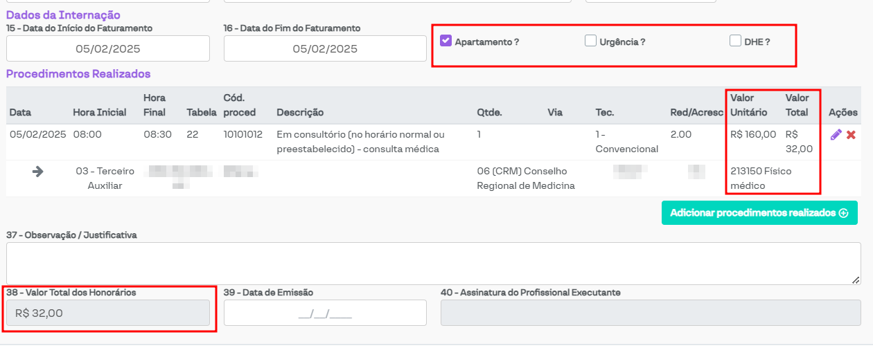 Segue o valor alterado após selecionar a opção Apartamento (lembrando que, para o valor ser atualizado, é necessário editar o procedimento executado).