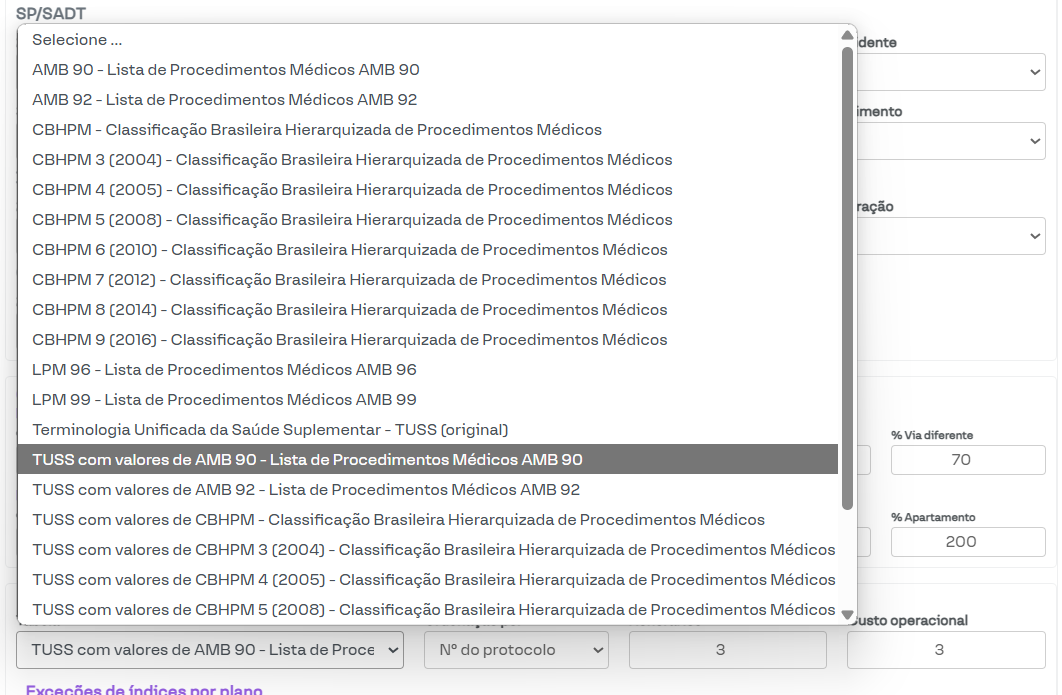 Nesta tabela, é possível selecionar a tabela de procedimentos que o convênio utiliza para identificar os procedimentos.