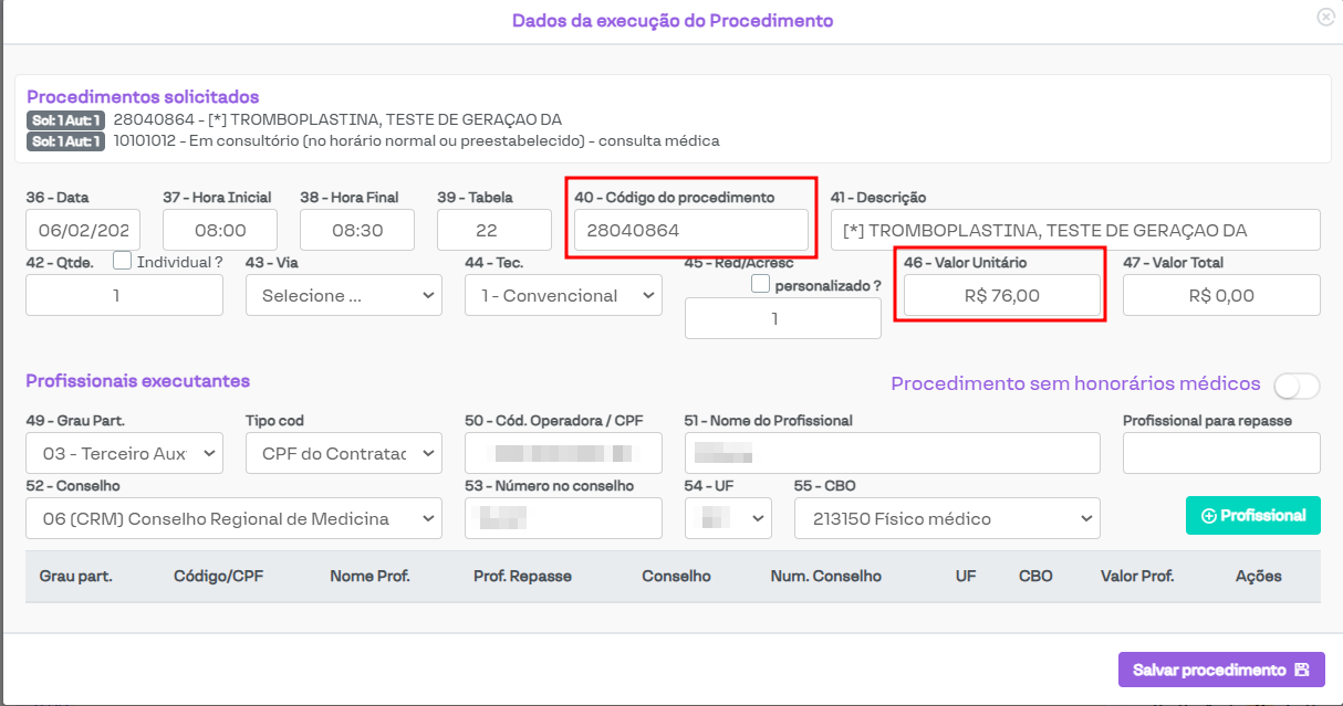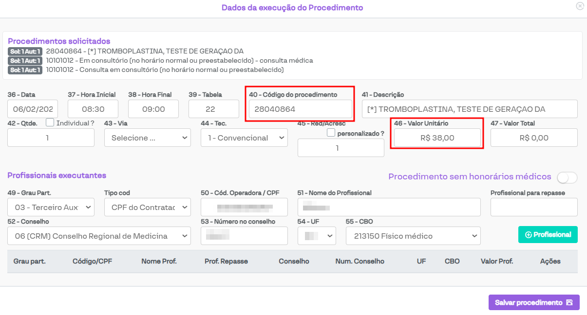Agora, vamos gerar as guias com o mesmo procedimento e verificar os valores. Ao gerar a guia com o convênio que possui o índice de honorários configurado como 1, o valor apresentado será o destacado na imagem abaixo.