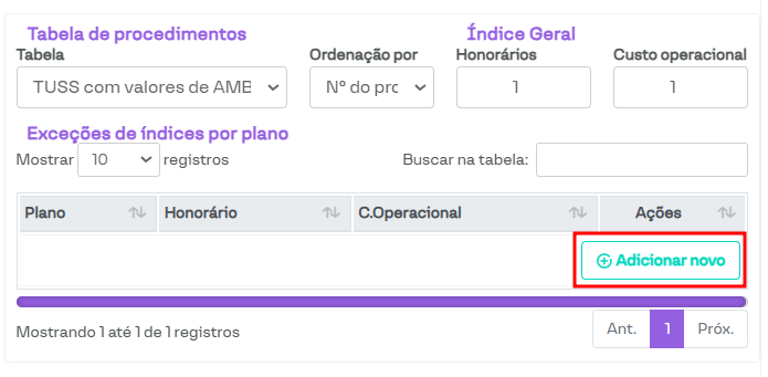 E referente a seção Exceções, é possível cadastrar um índice específico de acordo com o plano do convênio ao qual o paciente está sendo atendido. Para isso, basta clicar no botão Adicionar Novo, conforme destacado na imagem a seguir.
