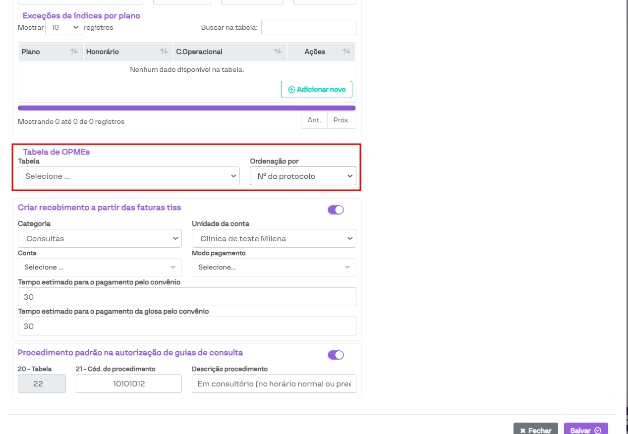 Nesta seção, é possível selecionar a tabela de OPMEs que o convênio utiliza para identificar as despesas.