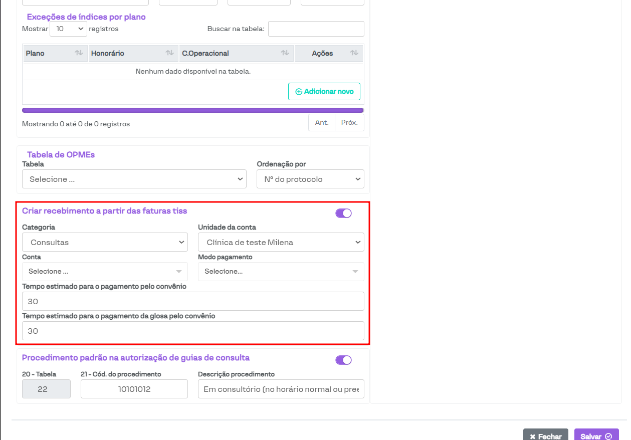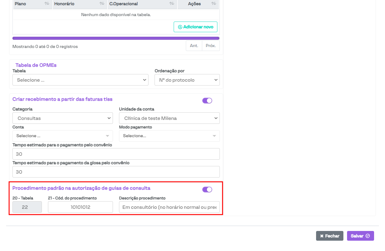 Nesta seção, é possível configurar o procedimento que o sistema preencherá automaticamente nas guias de consultas criadas.