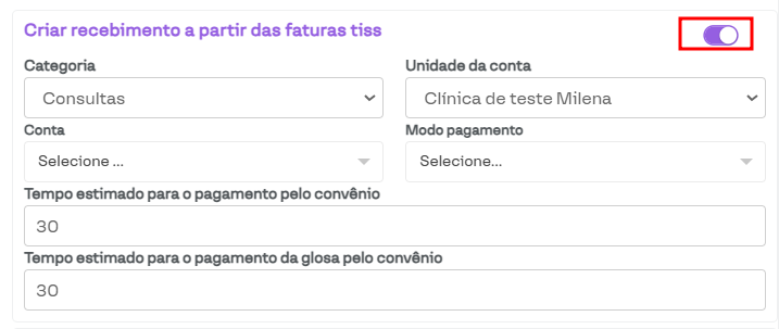 Os campos apresentados referem-se às informações que serão definidas ao criar o recebimento da fatura. No exemplo abaixo, definimos os campos com as informações de Categoria, Unidade da Conta, Conta, Modo de Pagamento, Tempo Estimado para Pagamento e Pagamento da Glosa.
