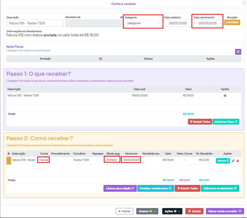 Ao criar o recebimento de uma fatura, essas informações são levadas em consideração no processo, conforme ilustrado na imagem abaixo.