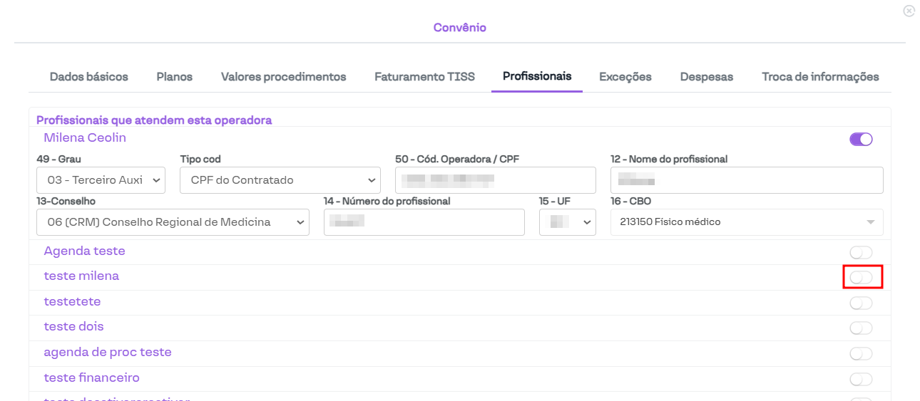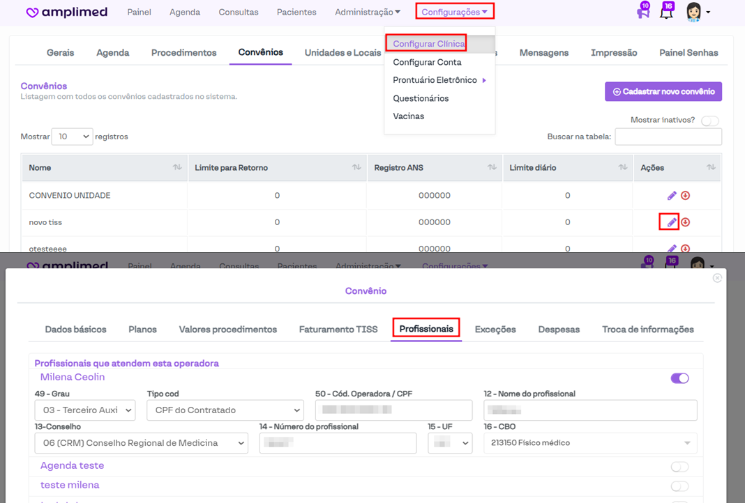 Acesse: Configurações > Configurar Clínica > Convênios > Editar convênio > Profissionais