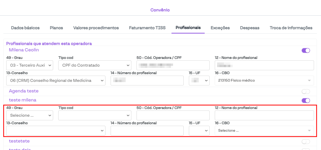 Nesta seção das configurações do convênio, é possível definir as informações dos profissionais que serão utilizados para preencher as guias do convênio.