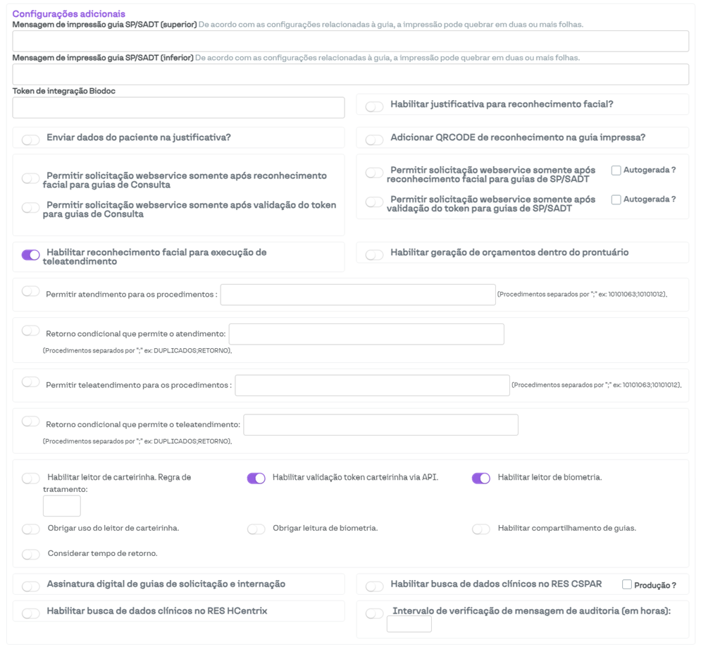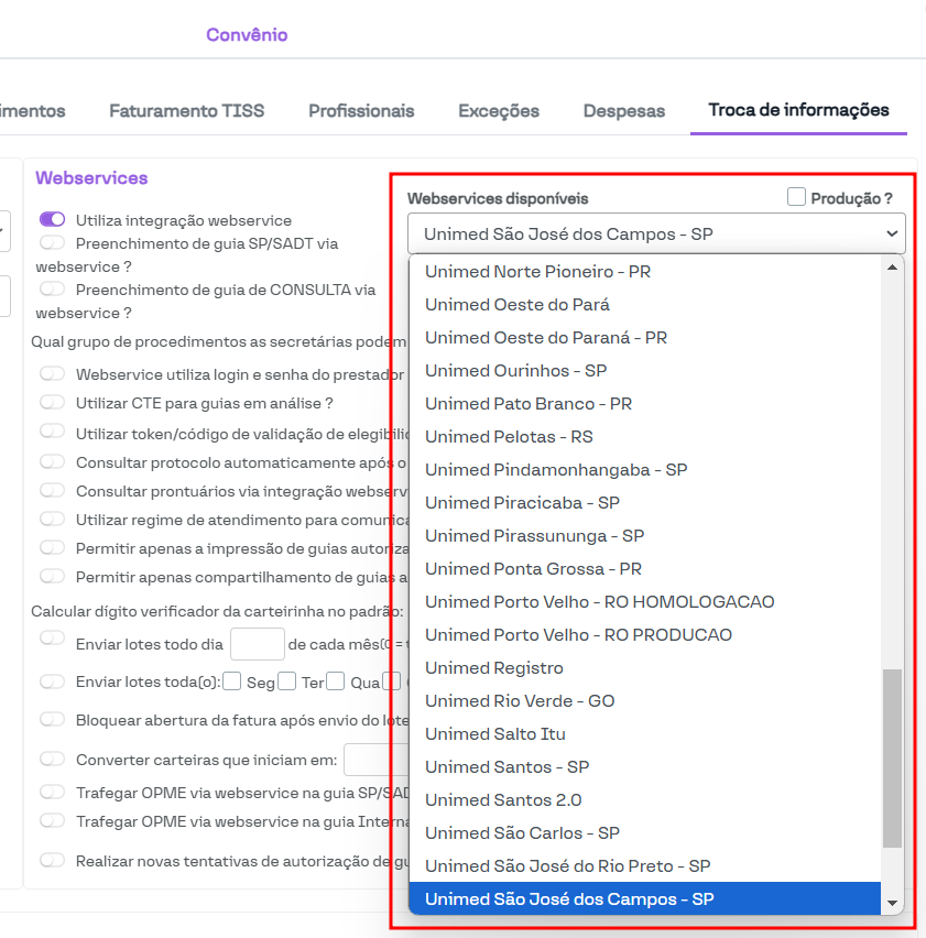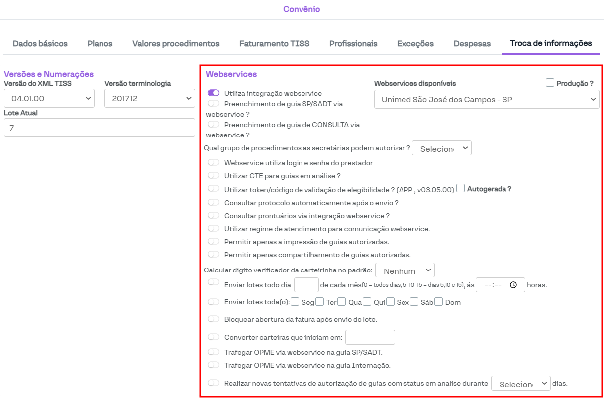 Nesta seção, é possível ajustar determinadas configurações relacionadas à integração do convênio com a operadora. Geralmente, essa seção é utilizada apenas por clínicas conveniadas à Unimed.