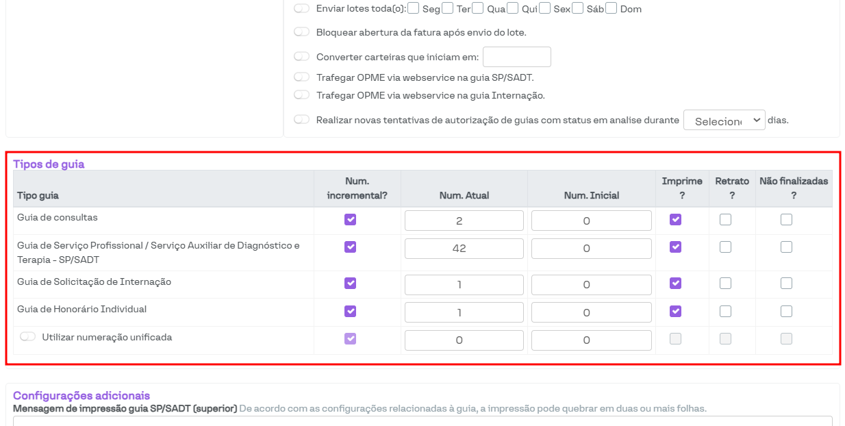Nesta seção, é possível configurar a numeração das guias e outras funcionalidades detalhadas a seguir.