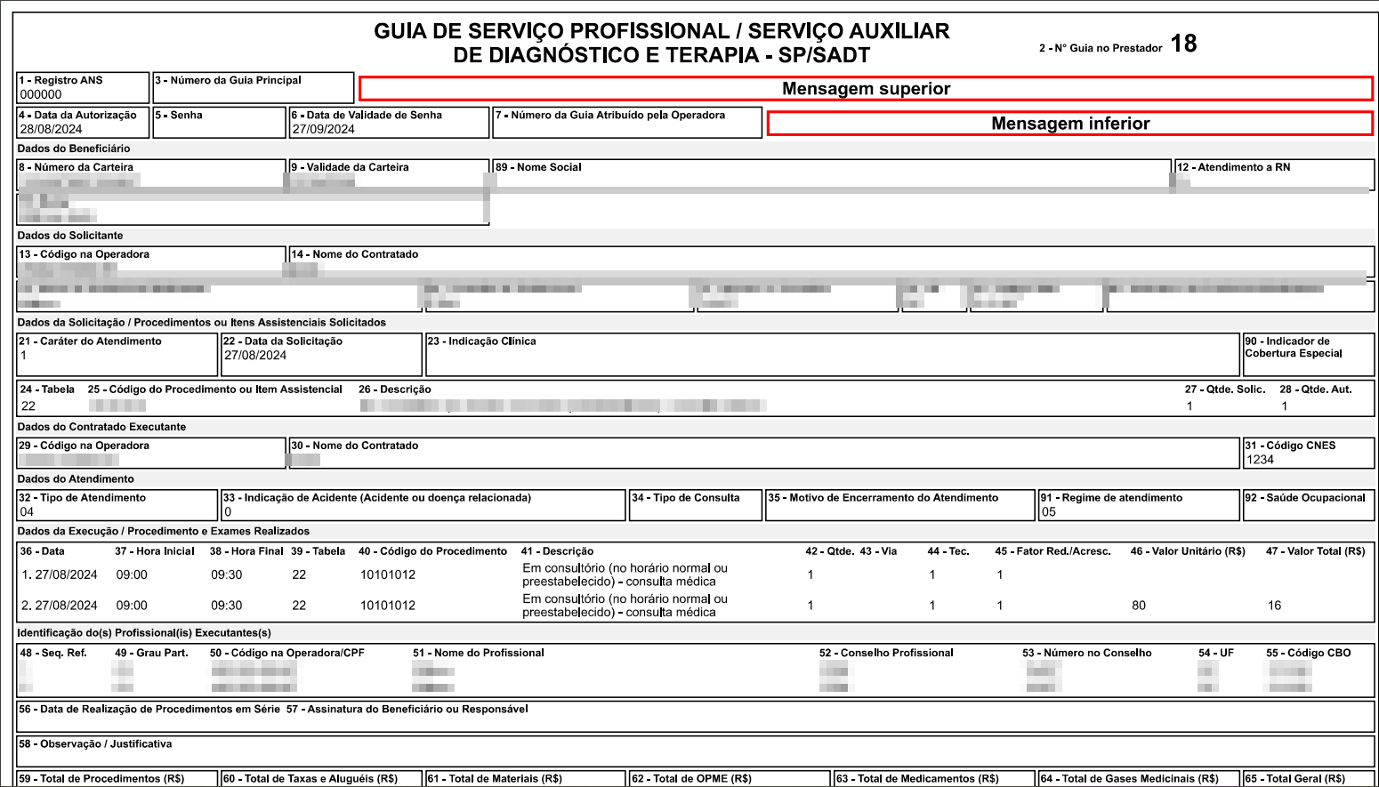 Mensagem de impressão guia SP/SADT - superior e inferior: Permite inserir uma mensagem nas guias ao imprimi-las no campo Observações, conforme ilustrado na imagem a seguir.