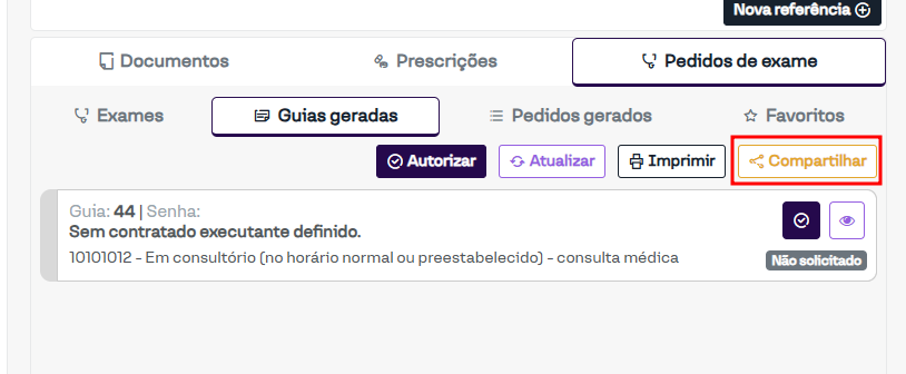 O campo Habilitar compartilhamento de guias ativa o botão para compartilhar a guia dentro do prontuário eletrônico, conforme ilustrado na imagem a seguir.
