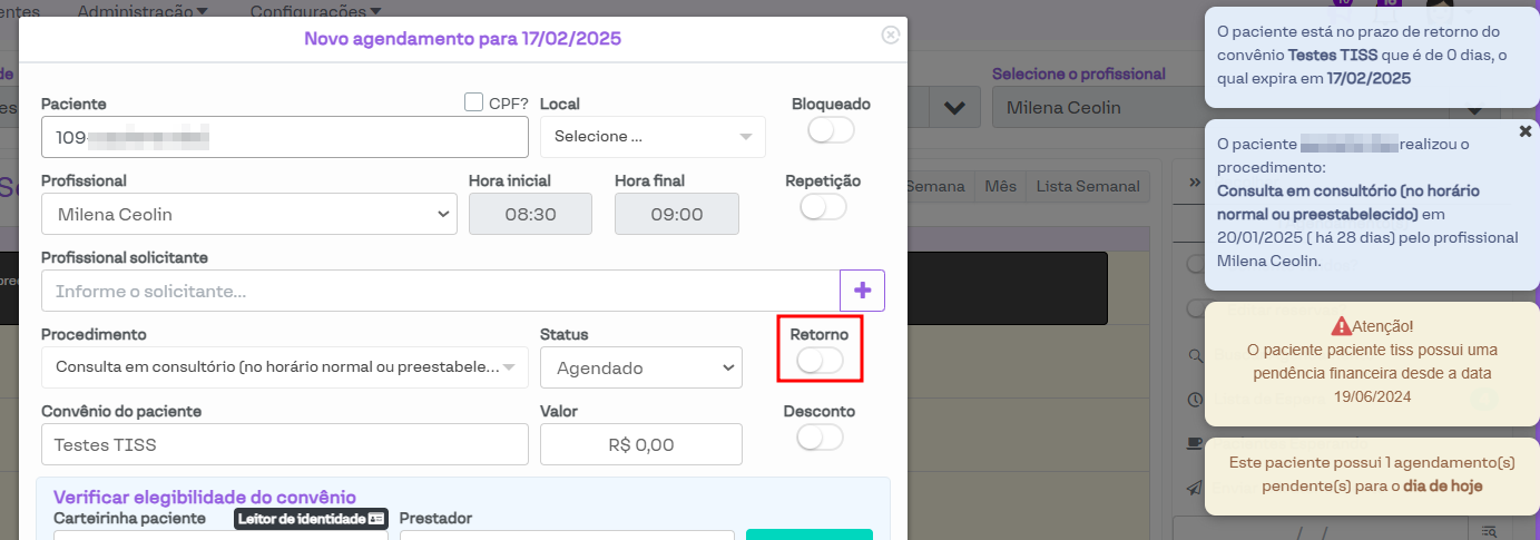 Além disso, o campo Retorno é habilitado nos casos em que o paciente está dentro do prazo permitido. Ao selecionar esse campo, a guia gerada por meio desse agendamento exibirá os avisos correspondentes, conforme demonstrado nas imagens a seguir.