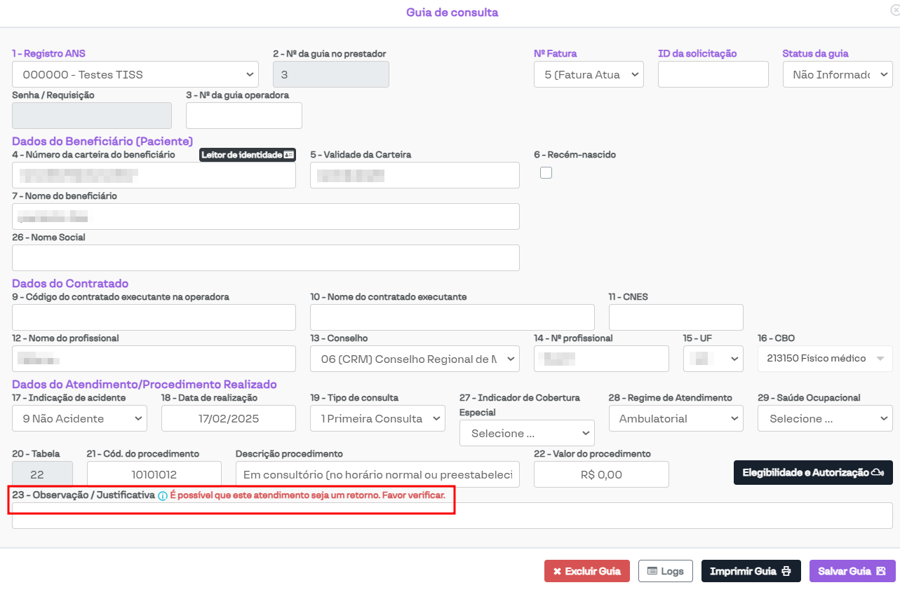 O campo Considerar tempo de retorno auxilia na verificação se o paciente já teve uma guia gerada com o procedimento Consulta nos últimos dias, informando o usuário por meio de uma notificação.
