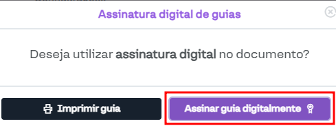 O campo Assinatura digital de guias de solicitação e internação permite assinar digitalmente as guias ao imprimir a Guia de Solicitação ou a Guia de Internação. Ao clicar no respectivo botão, será exibida uma janela perguntando se deseja realizar a assinatura, conforme ilustrado na imagem a seguir.