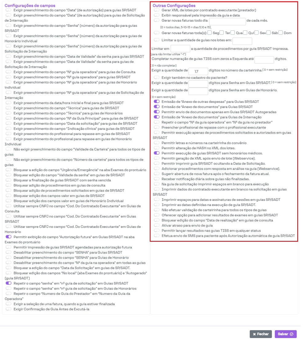 Exigir a quantidade de dígitos no número da carteirinha: Ao preencher esse campo, o sistema validará a quantidade de dígitos da carteirinha do paciente de acordo com o valor inserido.