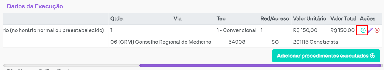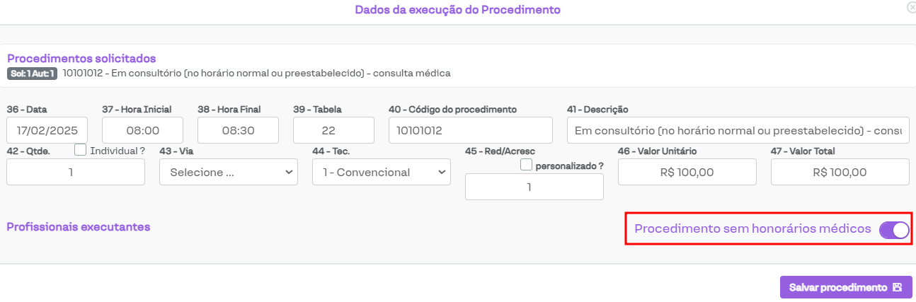 Permitir execução de guias SP/SADT sem honorários médicos: Ao ativar essa opção, será possível informar, na execução do procedimento, que ele não possui honorários médicos, conforme a imagem a seguir.