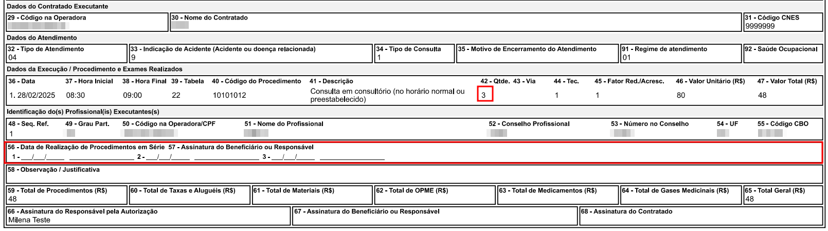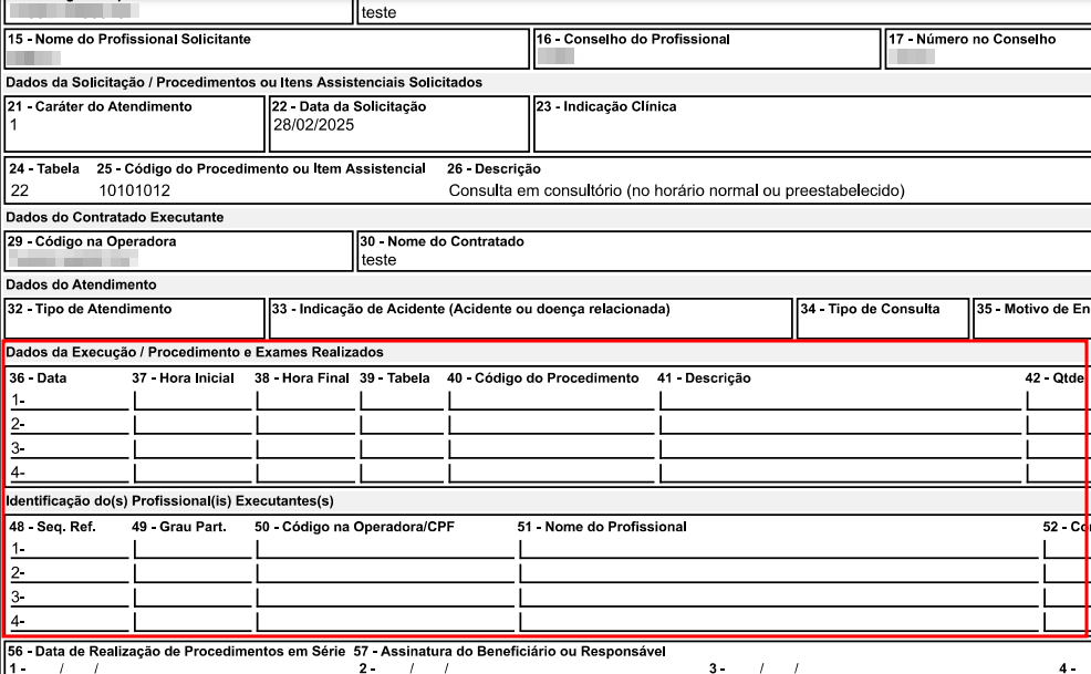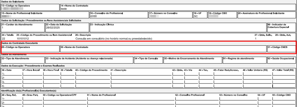 Imprimir dados do contratado executante em branco na solicitação em guias SP/SADT: Ao ativar essa opção, os campos 29, 30 e 31 (dados do contratado executante) não serão exibidos na impressão das guias de solicitação, conforme destacado na imagem a seguir.