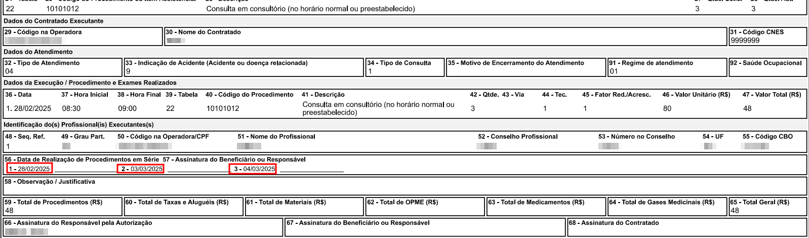 Imprimir espaços para datas e assinaturas de sessões em guias SP/SADT: Ao ativar essa opção, o sistema deixará espaços para a data e a assinatura ao imprimir a guia de execução de procedimentos que possuem sessões inclusas (ou seja, procedimentos executados mais de uma vez), conforme a imagem a seguir.