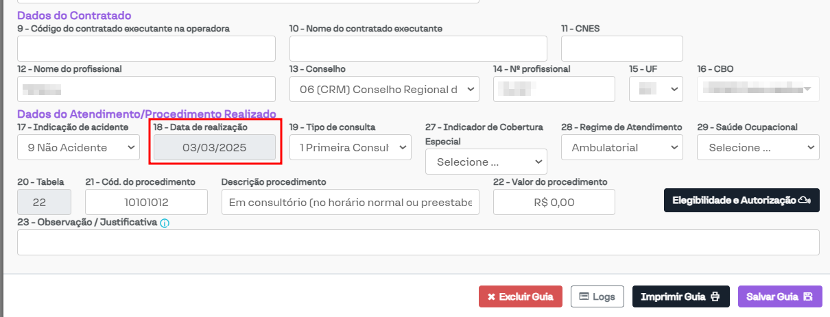 Bloquear edição do campo "Data de realização" em guias de consulta: Com essa opção ativada, o campo "18 - Data de realização" será bloqueado para edição.