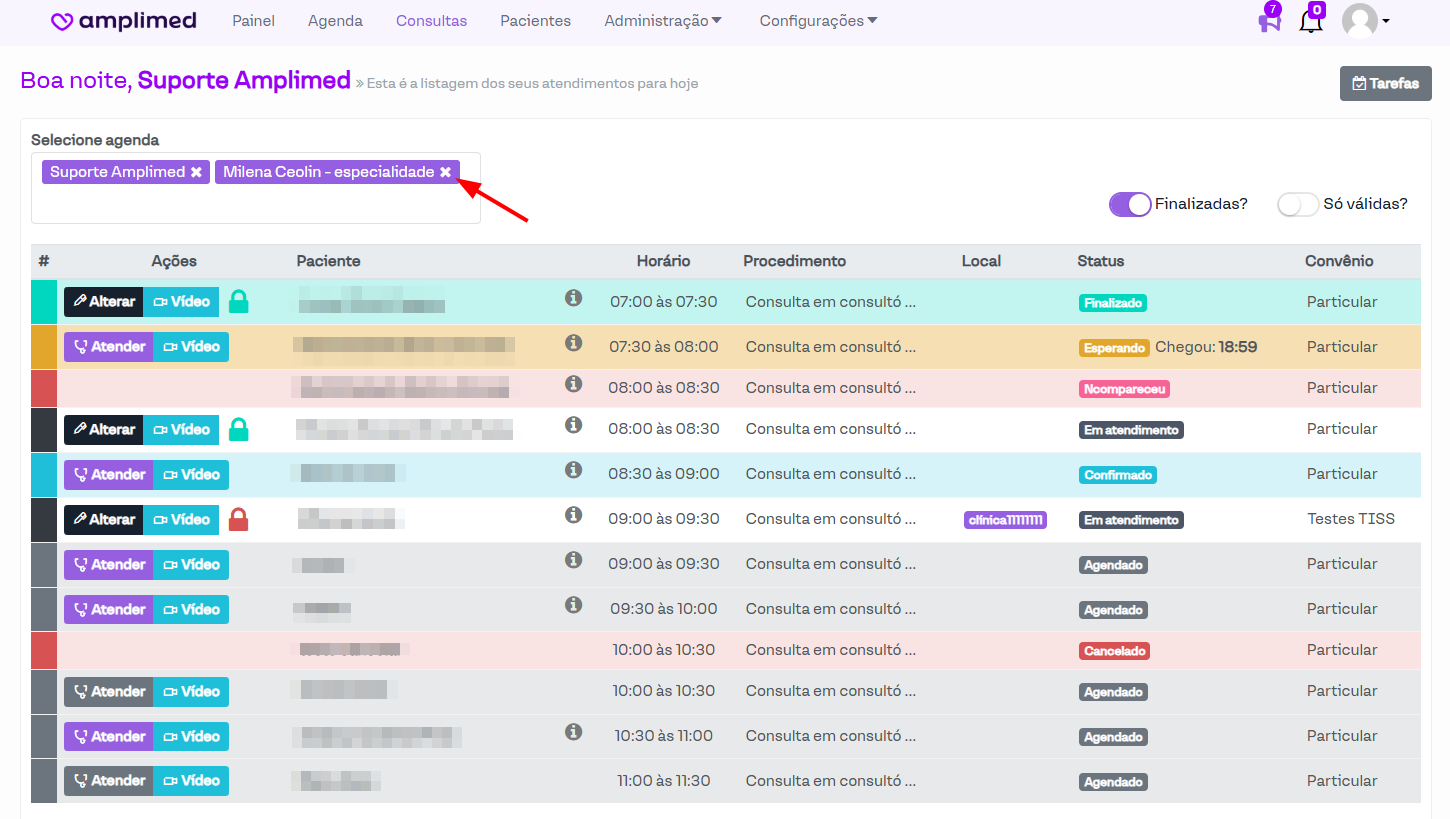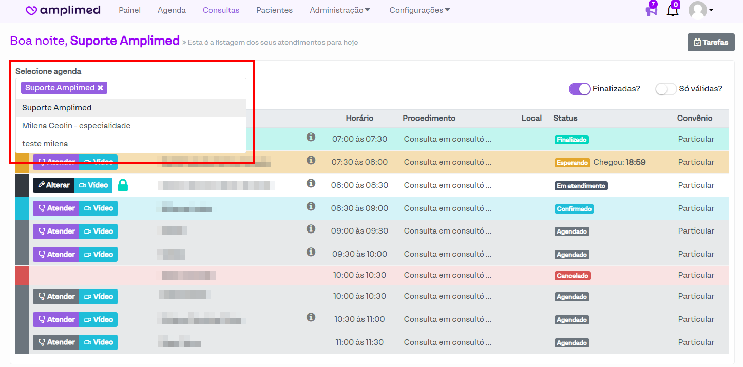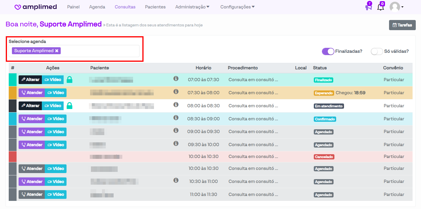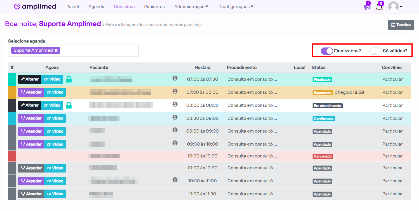 Só validas? - Se o botão estiver ativo (em roxo), o sistema exibirá apenas os agendamentos previstos para atendimento. Agendamentos com os status "Cancelado", "Não compareceu" ou "Reagendado" não serão exibidos, conforme ilustrado na imagem abaixo.