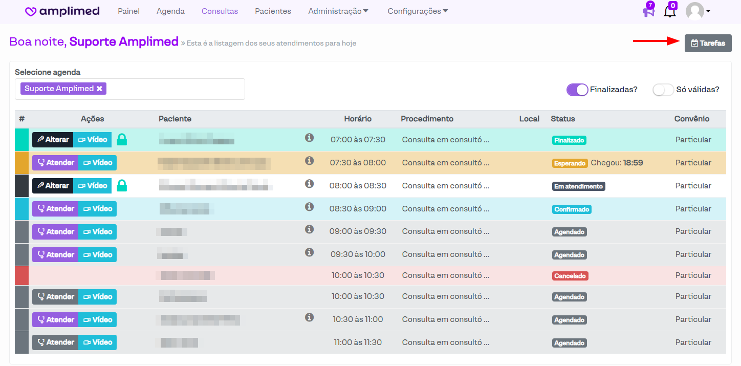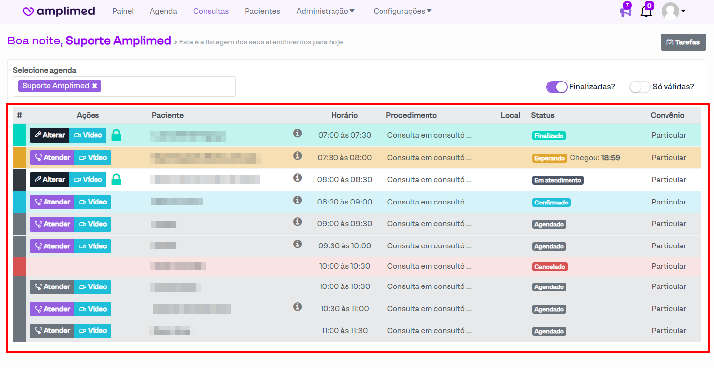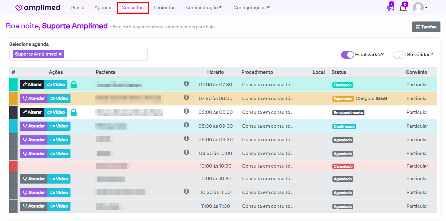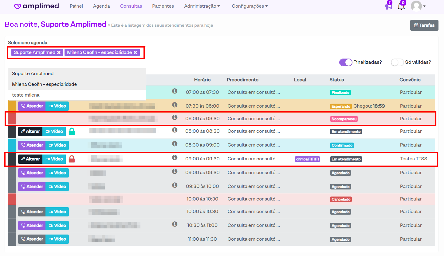 Só validas? - Se o botão estiver ativo (em roxo), o sistema exibirá apenas os agendamentos previstos para atendimento. Agendamentos com os status "Cancelado", "Não compareceu" ou "Reagendado" não serão exibidos, conforme ilustrado na imagem abaixo.