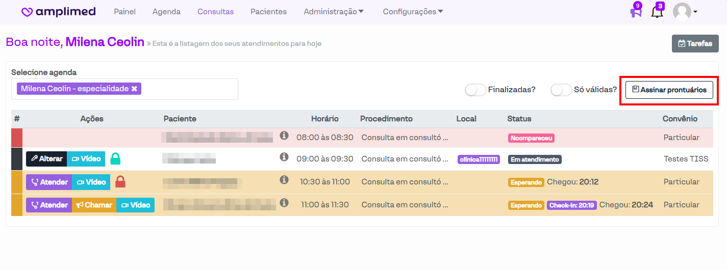 Já a opção de Assinar prontuários permite que o profissional assine digitalmente os prontuários finalizados.