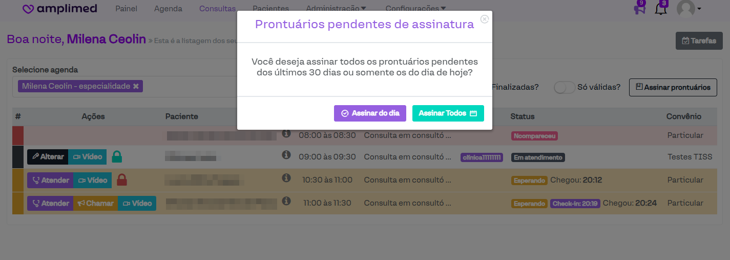 Ao clicar no botão, abrirá uma janela solicitando se deseja assinar os prontuários do dia, ou todos os prontuários finalizados dos últimos 30 dias.