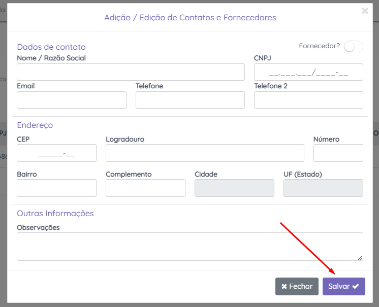 Ao finalizar, não se esqueça de clicar em "Salvar" e estará criado o seu Contato/Fornecedor!