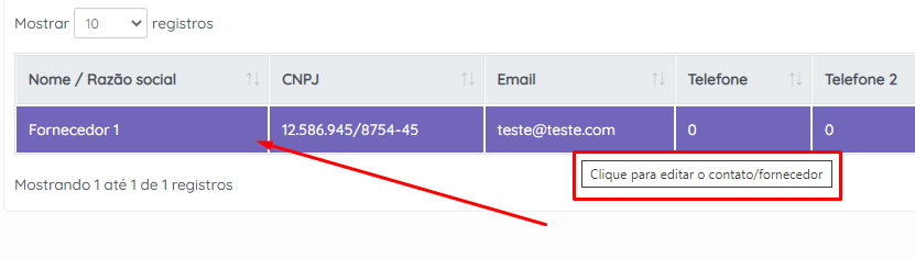 Para editar o cadastro de qualquer Contato/Fornecedor no sistema, basta acessar a aba de "Contatos", em seguida, buscar pelo cadastro desejado e clicar sobre ele: