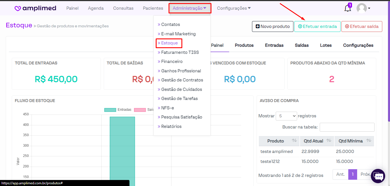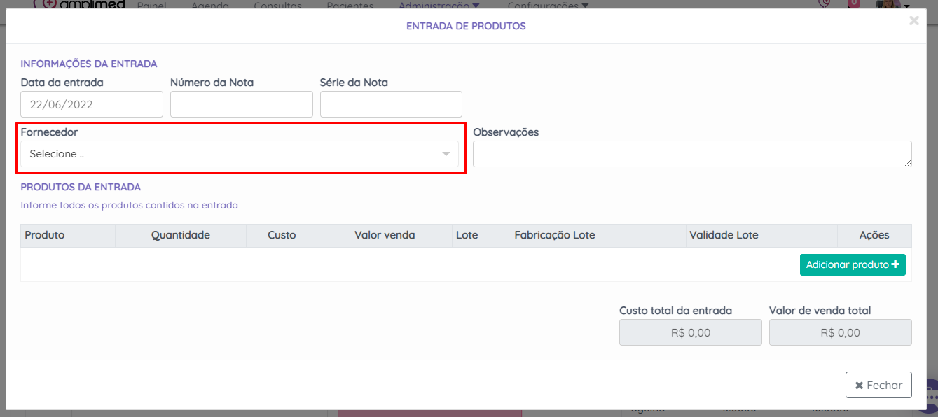 Uma das partes do sistema onde é solicitado o registro do Contato/Fornecedor é na efetivação das entradas dos produtos no nosso Módulo de Estoque. Para isso, precisa acessar em: >> Administração >> Estoque >> Efetuar Entrada:
