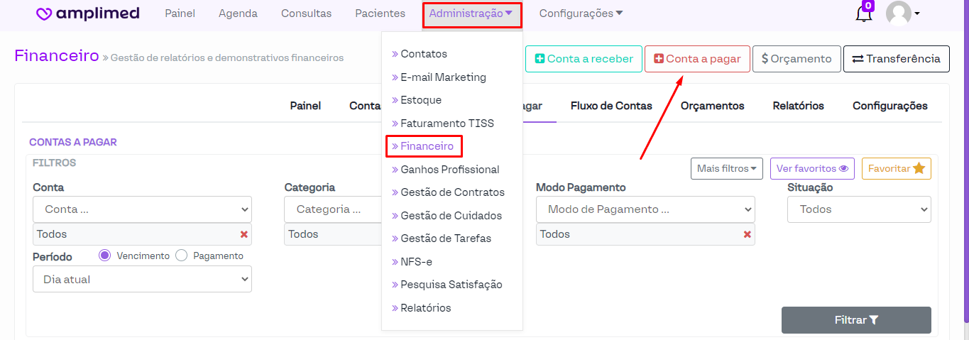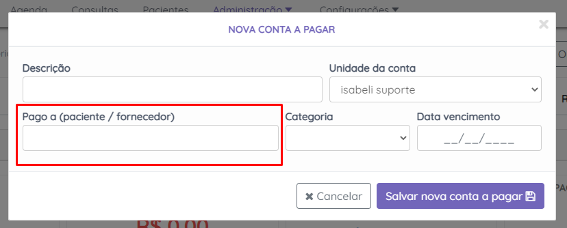 Outra parte do sistema onde o cadastro do Contato/Fornecedor é solicitado, é dentro do nosso Módulo Financeiro, mais especificamente no cadastro das Contas a Pagar. Este cadastro pode ser acessado em: >> Administração >> Financeiro >> Conta a Pagar: