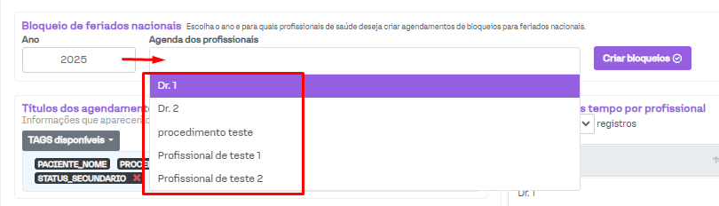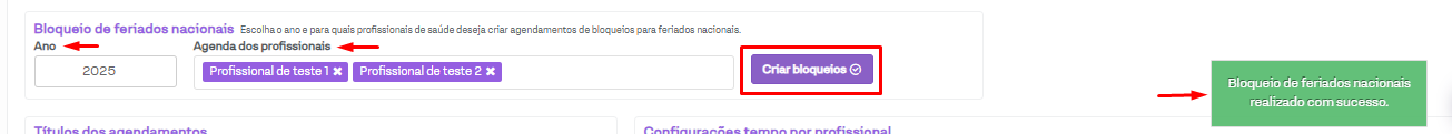 Para criar os bloqueios para os feriados nacionais, acessando a aba configurações da "Agenda", encontre o campo "Bloqueio de feriados nacionais". Confirme o ano que deseja criar os bloqueios e selecione a agenda dos profissionais.