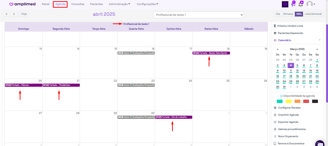 Os bloqueios serão criados automaticamente na agenda dos profissionais, mas podem ser gerenciados conforme a necessidade (ajustando o nome, alterando o horário de início e fim ou mesmo os excluindo).