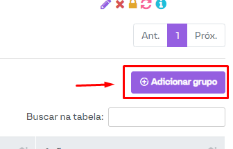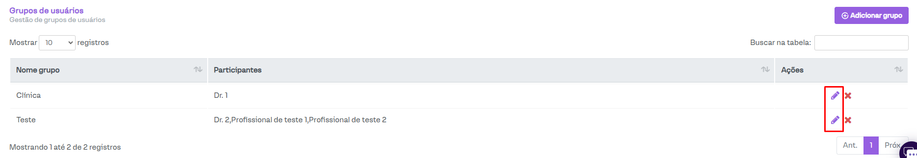 Para editar um grupo, localize ele e clique no ícone de lápis, em roxo, que estará localizado no final da linha à direita.