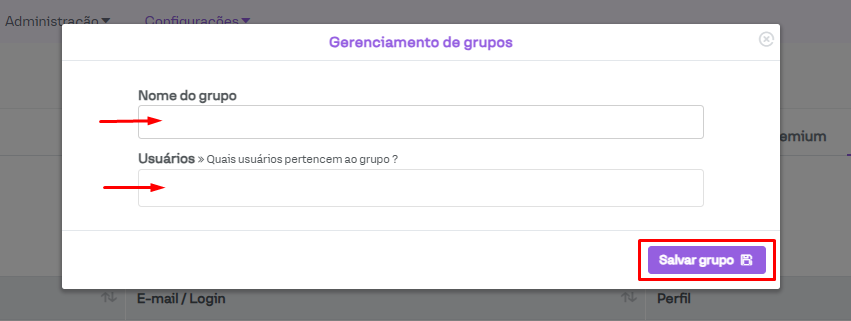Na janela que será aberta, insira o nome do grupo e selecione os usuários que farão parte deste grupo. Depois de preenchido, clique na botão "Salvar grupo"