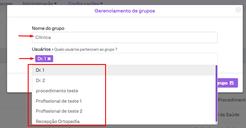 O grupo de usuários pode ser utilizado para facilitar a visualização da agenda destes grupo de profissionais, agilizando a criação de agendamento para os pacientes. Além disso, dependendo do fluxo da sua clínica, podem ser criados grupos para o atendimento multiprofissional ou ainda grupos voltados para os atendimentos de uma determinada condição ou especialidade.
