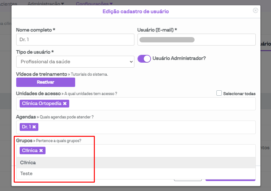 Lembrando que além deste caminho para adicionar os usuários ao grupo criado, também é possível adicionar um usuário a um determinado grupo de usuários através da edição do do próprio usuário, como mostrado abaixo. Para mais informações, acesse o artigo: Editar usuários de sua clínica