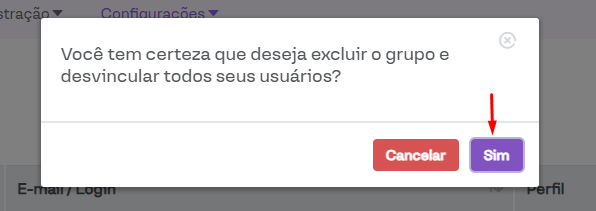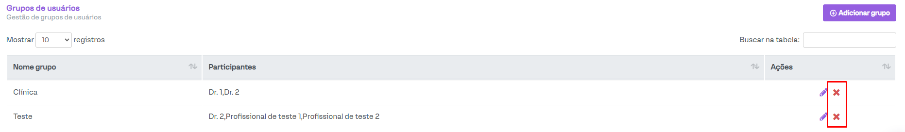 Caso seja preciso excluir um grupo de usuários também é possível! Para isso, basta escolher o grupo e clicar no ícone de "x", em vermelho, no final da linha à direta.