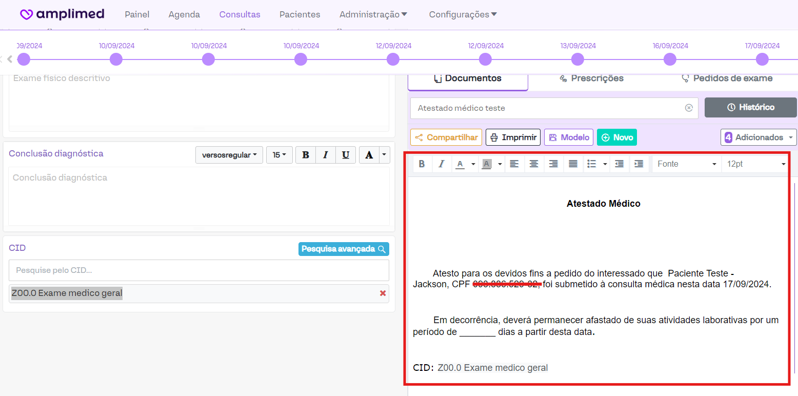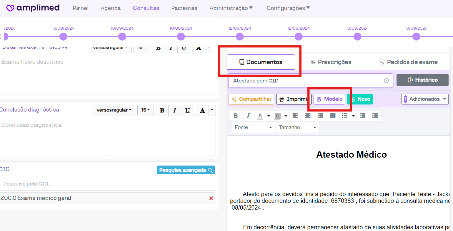 Clicar em "Atender" o paciente > "Documentos" > No campo de edição criar um documento ou colar um documento copiado do Word / computador > "Clicar em modelo":