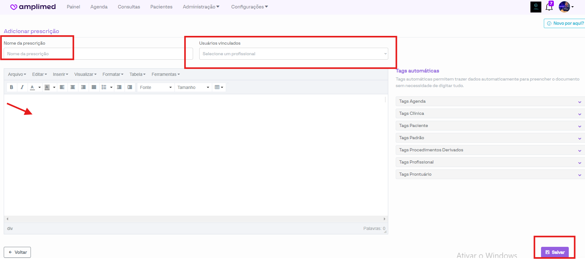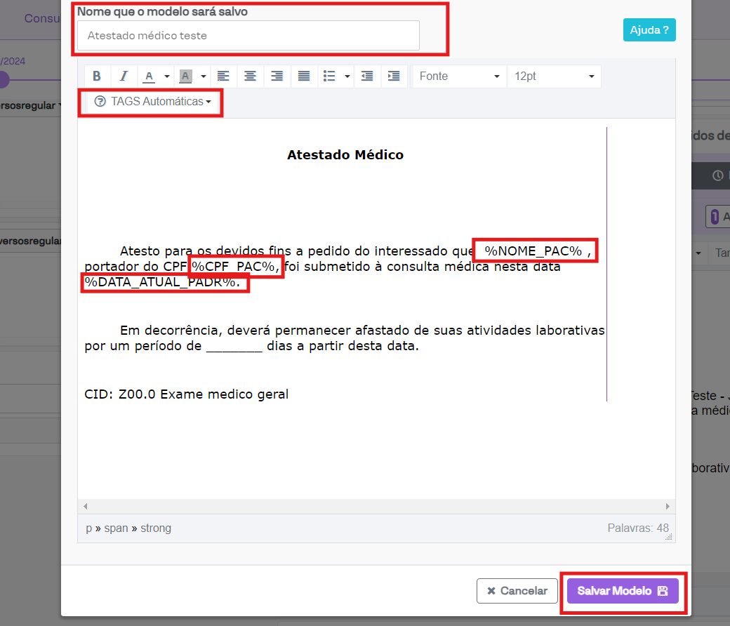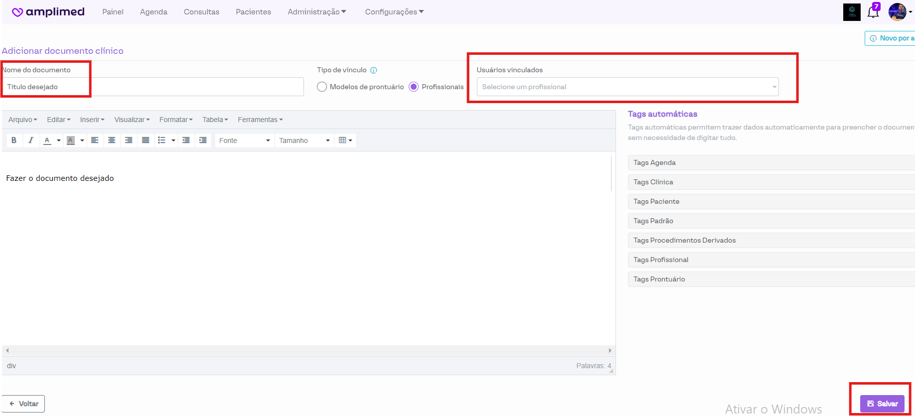 Incluir o nome desejado para o título e substituir os dados pessoais presentes no documento por uma tag automática, como exemplo o nome do paciente, CPF e posteriormente > "Clicar em salvar".