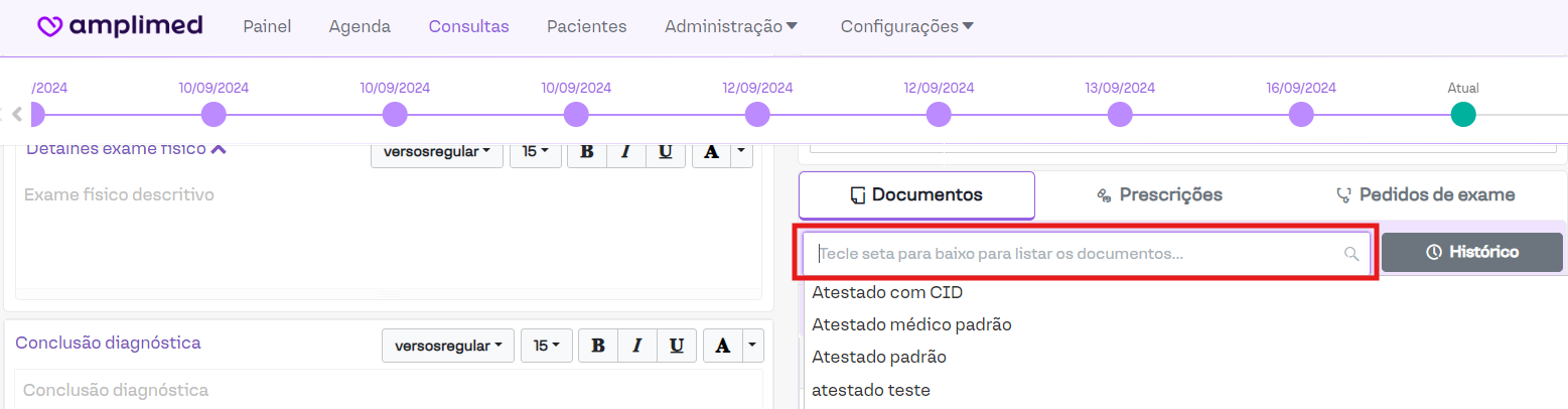 Para utilizar o modelo que foi criado, clicar no campo "Tecle seta para baixo para listar os documentos..." e teclar o botão para baixo do teclado, irá carregar todos os modelos salvos. Basta selecionar o documento desejado e o mesmo será automaticamente preenchido com os dados do paciente que está sendo atendido.