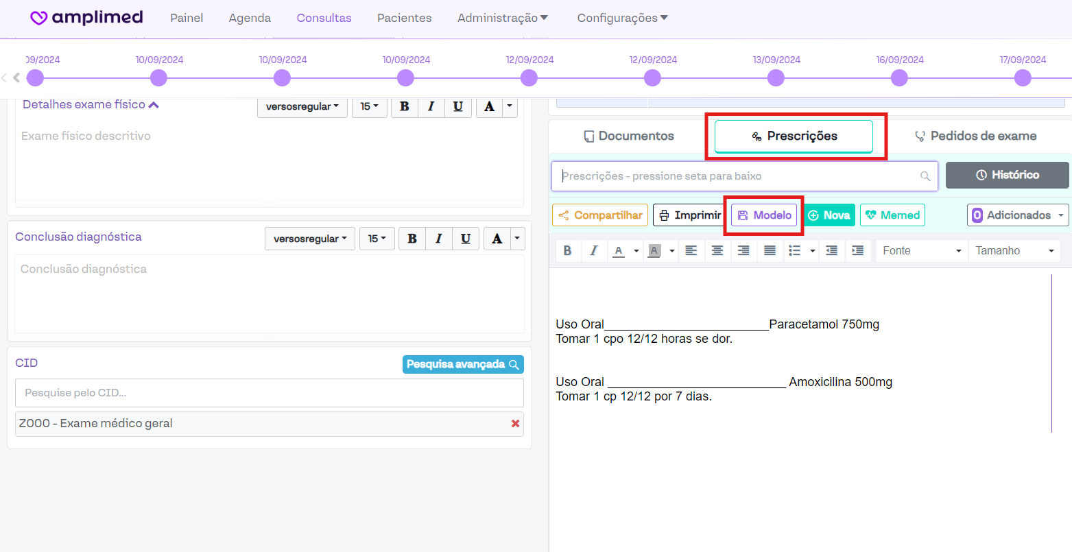 Caso deseje, o profissional pode salvar o modelo dessa prescrição, clicando em "Modelo":