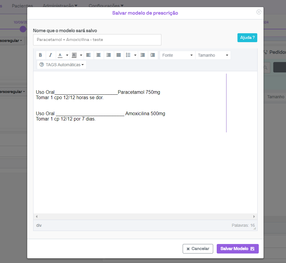 Criar o nome a ser salvo> fazer ou editar a prescrição e clicar em "Salvar modelo":