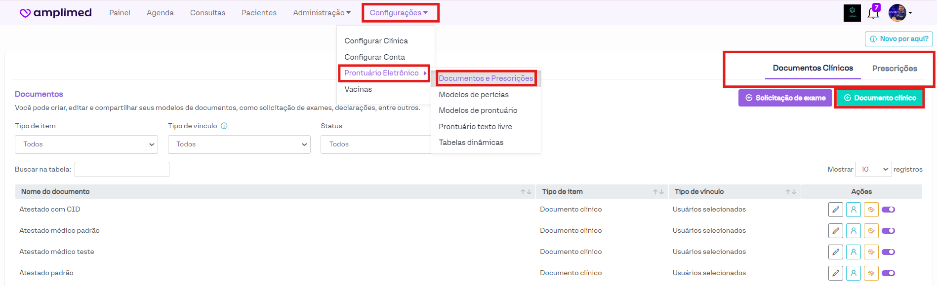 Conforme supracitado, o segundo modo de criar um documento ou uma prescrição é via configurações do prontuário. Clicando em "Configurações" > "Prontuário Eletrônico" > "Documentos e Prescrições":
