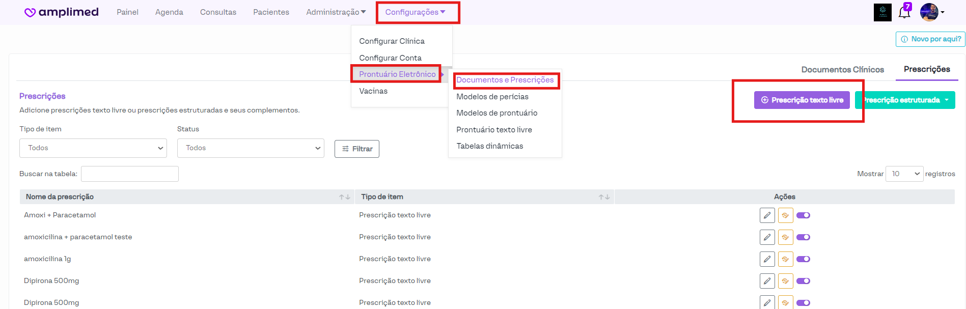 Para criar uma prescrição sem estar com o prontuário do paciente aberto, basta fazer o mesmo processo descrito no item 2, seguindo o caminho: "Configurações" > "Prontuário Eletrônico" > "Documentos e Prescrições" > "+ Prescrição texto livre".