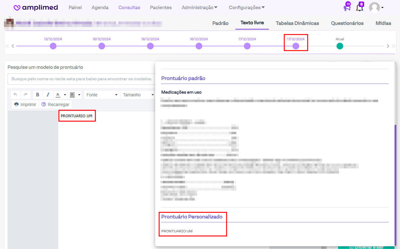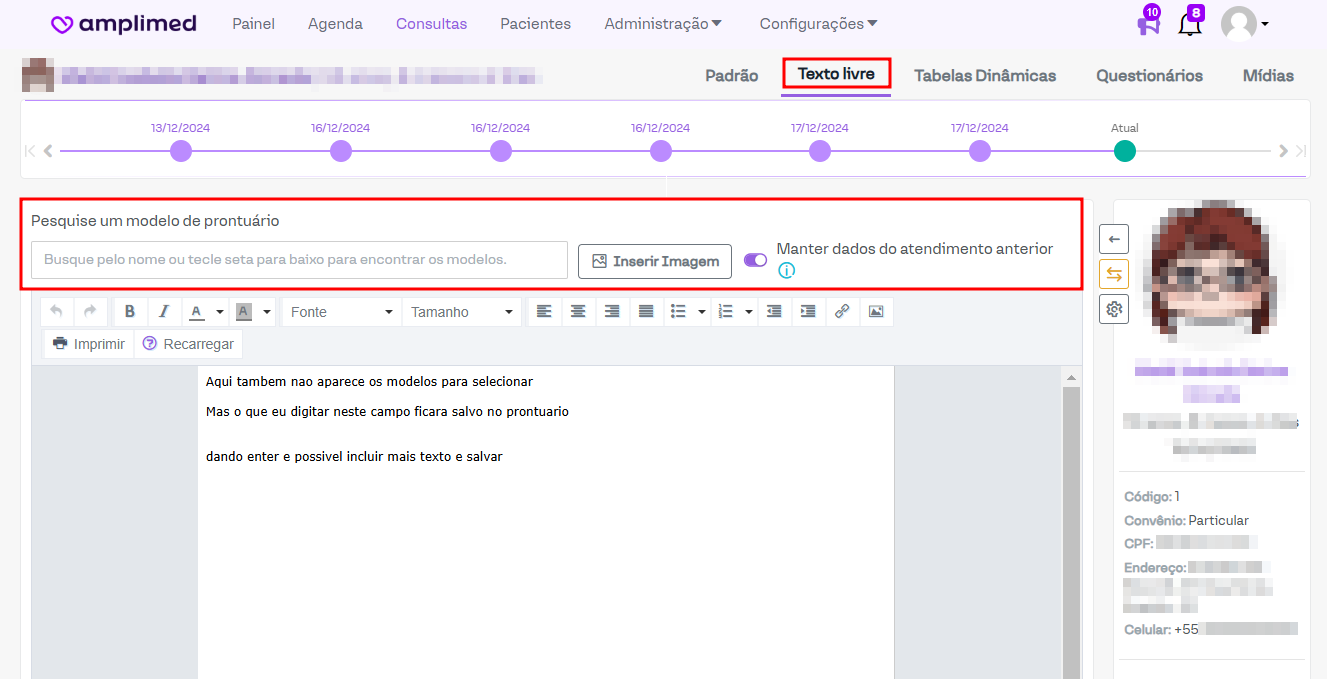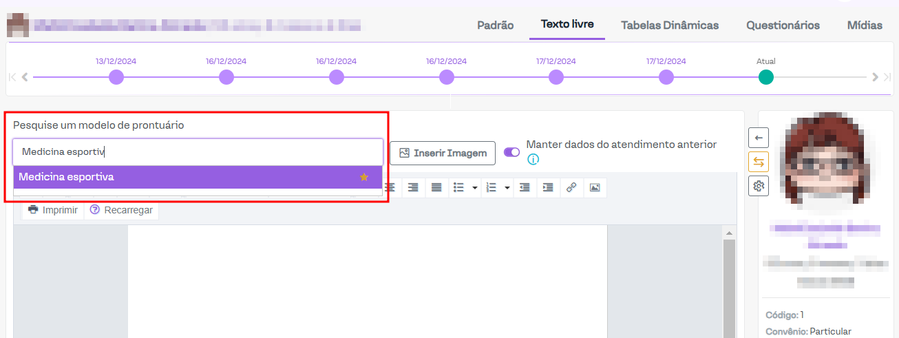 O modelo de texto livre do prontuário permite redigir o conteúdo diretamente em um campo de texto livre ou utilizar modelos pré-configurados.